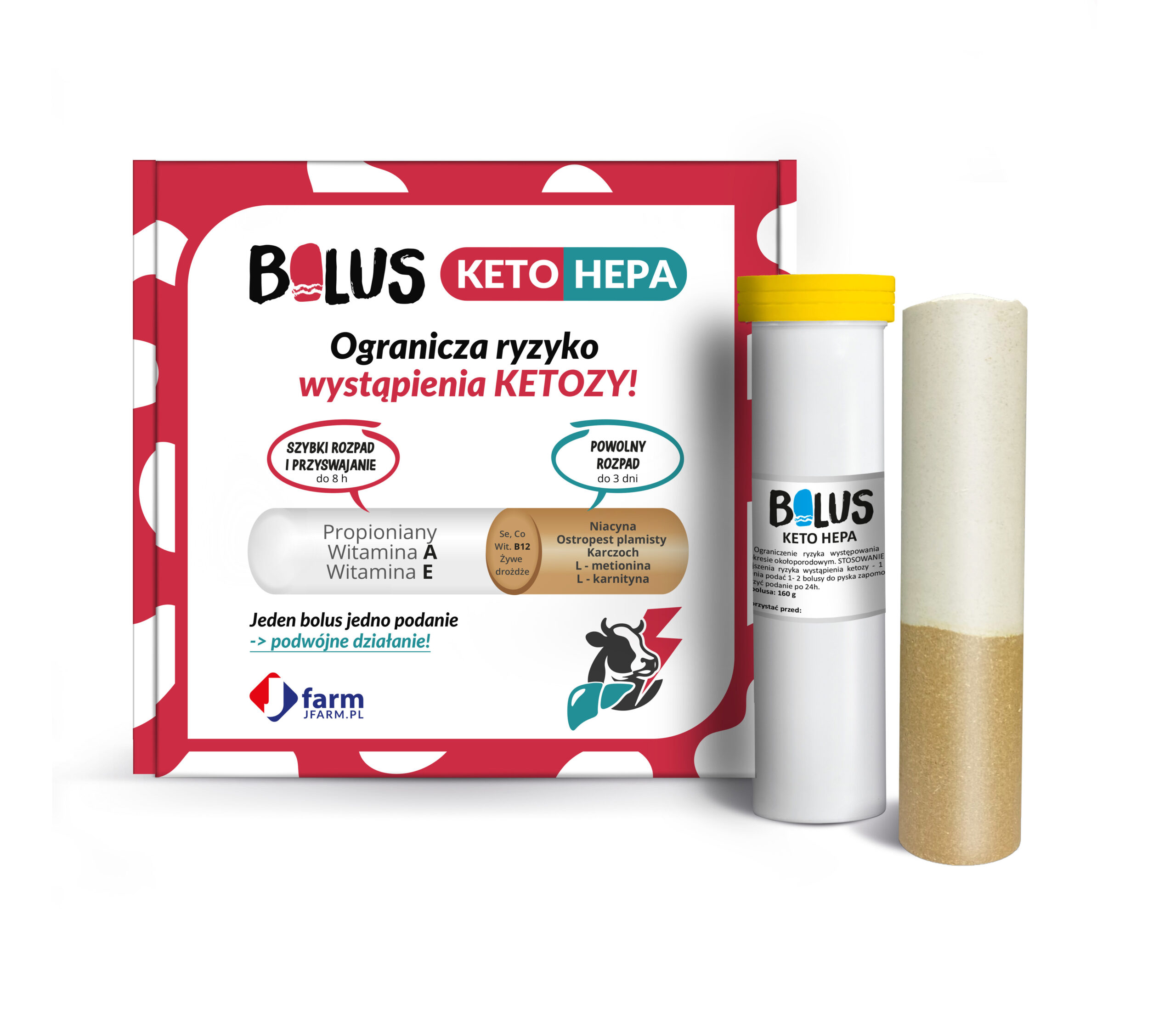 • bolus składa się z dwóch części, różniących się szybkością rozkładu w żwaczu – część szybko uwalniająca – dostarcza łatwo przyswajalnej energii, część wolno uwalniająca – dostarcza składników, które wspierają regenerację wątroby oraz usprawniają procesy energetyczne,